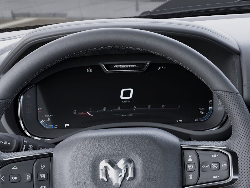 Granite Crystal Metallic Clearcoat 2026 Ram 1500 Rebel 4WD 8-Speed Automatic 3.0L I6 Bed Utility Group (Exterior 115V AC Outlet, MOPAR 4 Adjustable Cargo Tie-Down Hooks, and MOPAR Spray in Bedliner), Quick Order Package 21W Rebel, Rebel Level 2 Equipment Group (115V Auxiliary Rear Power Outlet, 14.4" Touchscreen Display, 2-Door Passive Entry, Front Door Locks, 4G LTE Wi-Fi Hot Spot, Accent Color Door Handles, Accent Color Premium Power Mirrors, Accent Color Tailgate Handle, Apple CarPlay, Auto Power-Folding Mirrors, Auto-Dimming Exterior Driver Mirror, Black Painted Exterior Mirrors Caps, Connected Travel and Traffic Services, Connectivity - US/Canada, Convex Wide-Angle Exterior Mirror Insert, Disassociated Touchscreen Display, Driver Seat Memory, Dual Wireless Charging Pad, Exterior Mirrors Approach Lamps, Exterior Mirrors Courtesy Lamps, Exterior Mirrors with Heating Element, Exterior Mirrors with Memory, Exterior Mirrors with Supplemental Signals, Front Passenger Interactive Display, Global Telematics Box Module, Google Android Auto, GPS Antenna Input, GPS Navigation, Harman/Kardon 19 Speaker Premium Sound, HD Radio, Heated Second Row Seats, Integrated Center Stack Radio, Integrated Voice Command with Bluetooth, Media Hub with 2 Charge Only USBs, Off-Road Information Pages, Power 2-Way Passenger Lumbar Adjust, Power Adjust 8-Way Front Passenger Seat, Power Adjustable Pedals with Memory, Power Tailgate, Proximity Approach/Departure Lamps, Radio: Uconnect 5 Nav with 14.4" Display, Radio/Driver Seat/Mirrors/Pedals Memory, Rain Sensitive Windshield Wipers, Rear Window Defroster, Security Alarm, SiriusXM Radio Service, SiriusXM with 360L, Smartphone as a Key Capable, and USB Host Flip), 10 Speakers, 3.92 Rear Axle Ratio, 4 Way Front Headrests, 4-Wheel Disc Brakes, ABS brakes, Active Noise Control System, Air Conditioning, Alloy wheels, AM/FM radio: SiriusXM with 360L, Apple CarPlay/Android Auto, Auto High-beam Headlights, Auto-dimming Rear-View mirror, Automatic